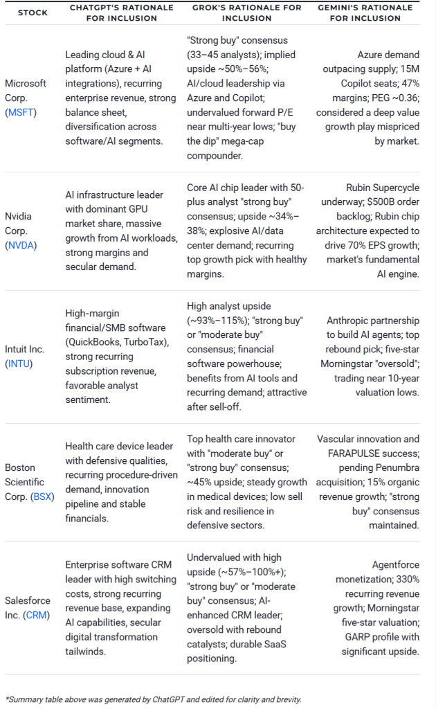 “Salesforce is on the list because it’s a high-quality enterprise software company with secular tailwinds, recurring revenue, strong AI integration and solid analyst support – combining growth potential with a relatively defensible market position,” ChatGPT says.
